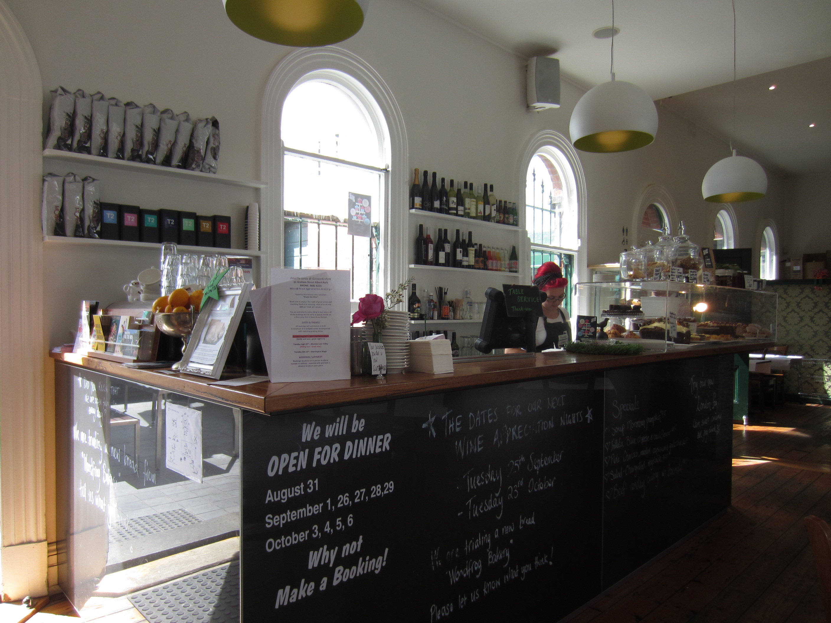 Priscilla Jones is open everyday for breakfast and lunchies, as well as some nights for dinner in conjunction with Gasworks Performing Arts next door, some Tuesday evenings for wine appreciation nights and afternoon tea every Tuesday, Saturday and Sunday between 2:00-4:00pm. Make sure you give the cafe a buzz to confirm dates and make bookings…